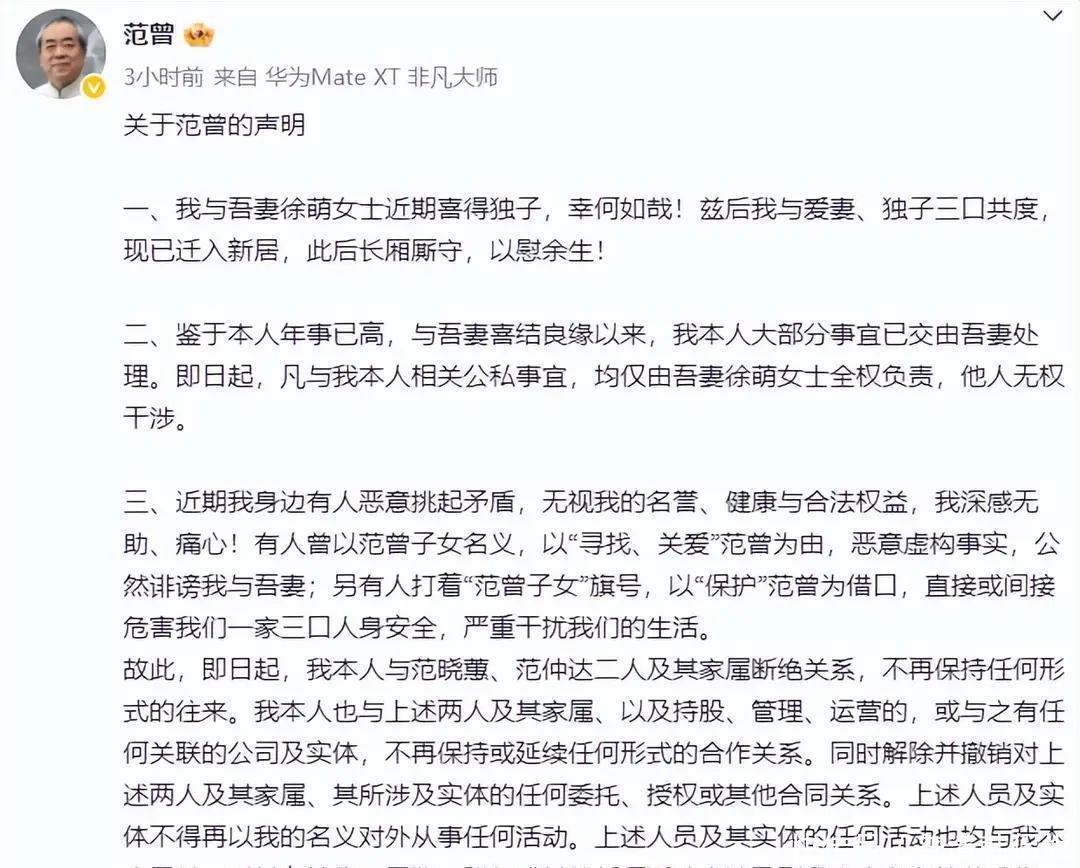 12日,范曾在社交平台发了一则声明,主要说了三件事:第一,他和比自己岁的妻子徐萌生了个儿子,一家三口搬进了新家;第二,以后所有事情都交给徐萌处理,别人别插手;第三,他要和女儿范晓蕙、继子范仲达彻底断绝关系,以后老死不相往来。