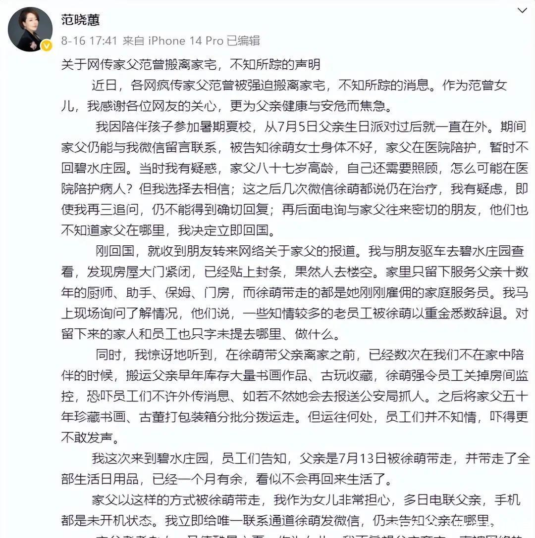 今月,范晓蕙发现父亲范曾和家里价值不菲的古董字画一起“消失”了,急得在网上发文,暗示是徐萌把老爷子“藏”了起来,还阻挠父女联系。